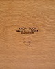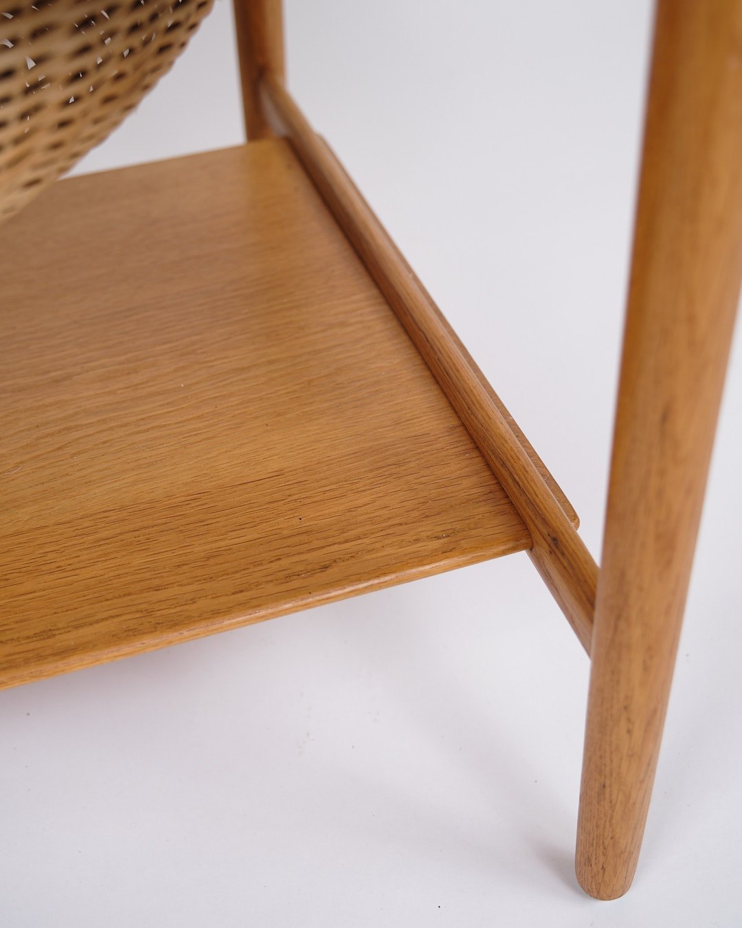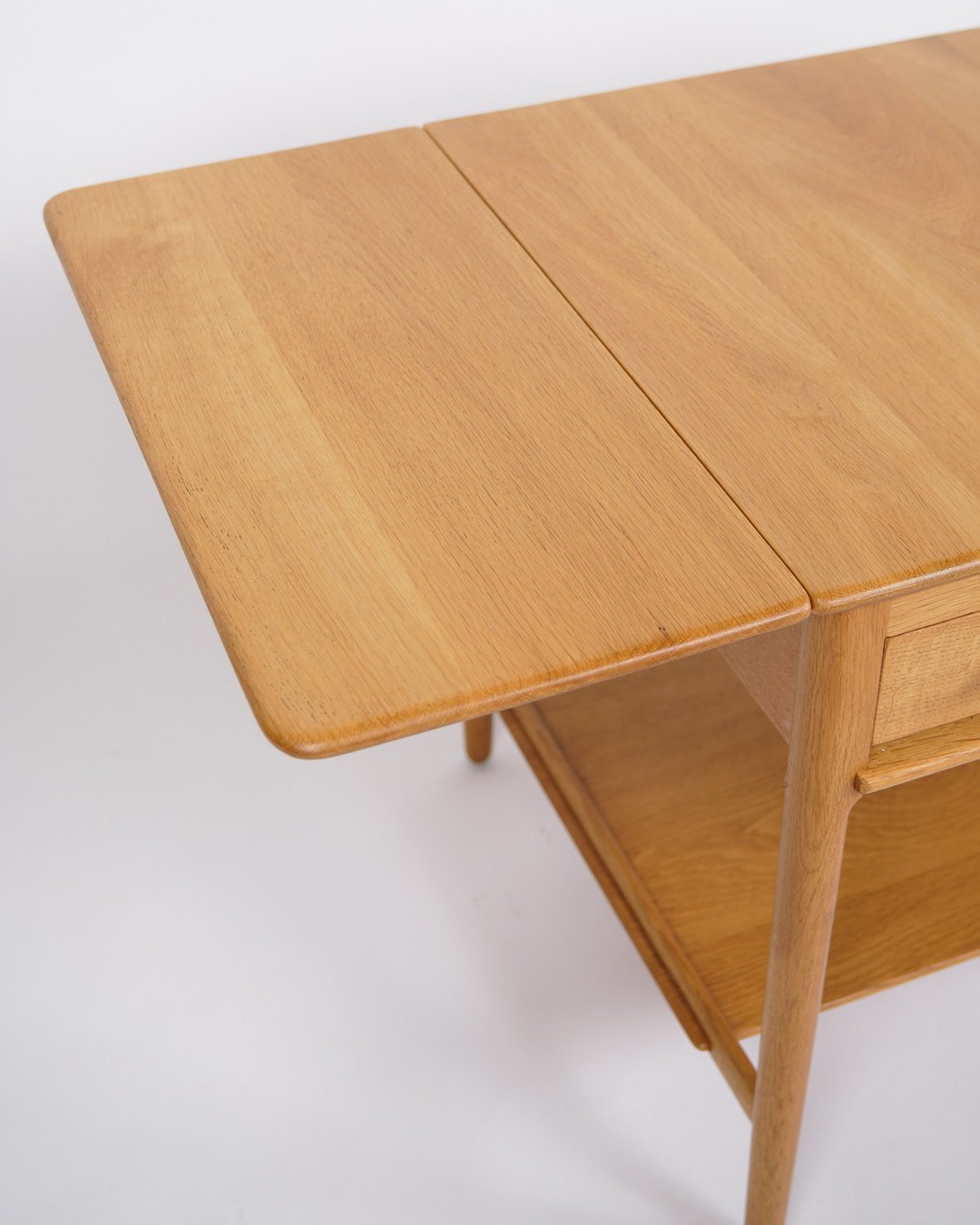 Sybord, model AT-33, designet af Hans J. Wegner og produceret af Andreas Tuck i 1950’erne. Bordet er udført i sæbebehandlet egetræ og indrettet med en praktisk hylde. Bordpladen kan udvides fra 64,5 cm til 118,5 cm, hvilket gør det både fleksibelt og funktionelt.