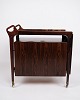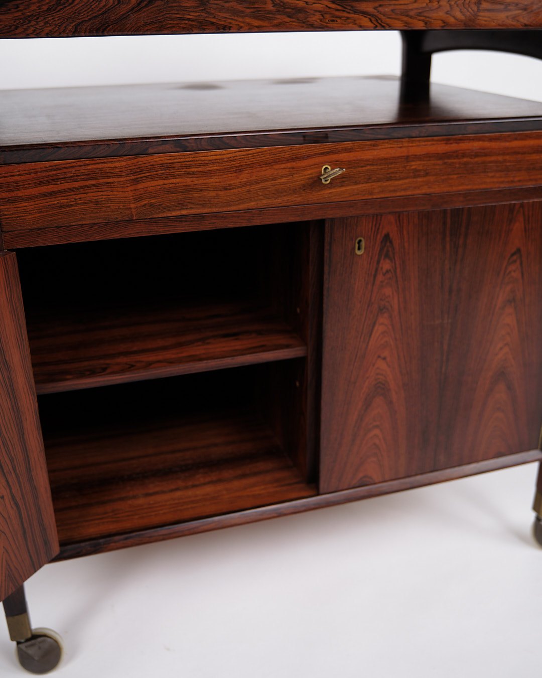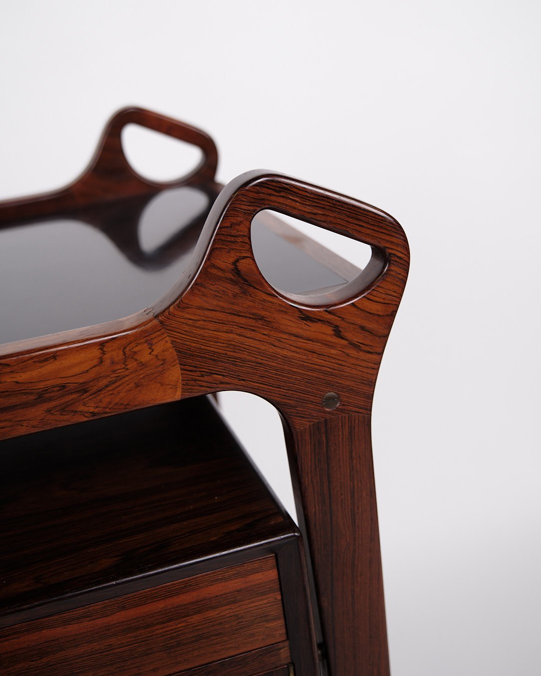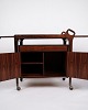 barskab fra Dyrlund, udført i palisander med sort formika og håndtag i massiv palisander. Skabet er monteret på hjul for nem mobilitet og har en foldbar plade, der kan udvide bredden fra 86 cm til 142 cm. Kombinationen af eksklusive materialer og funktionelt design gør dette barskab til et klassisk eksempel på dansk møbelhåndværk fra 1960’erne.