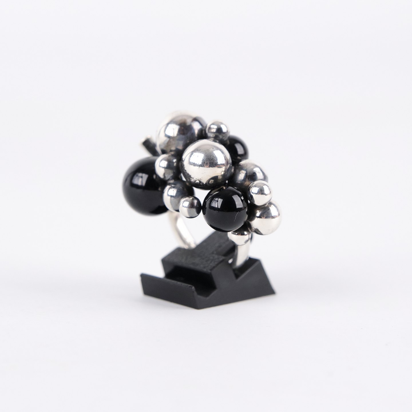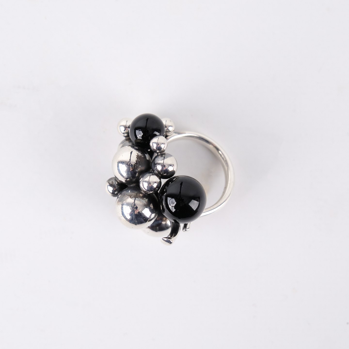 Georg Jensen ring i sterling sølv, model 54 fra Moonlight Grapes-kollektionen. Ringen har det karakteristiske drueornament, som måler 3 × 2,5 cm, og fremstår som et klassisk eksempel på Georg Jensens organiske formsprog. Elegant smykke udført i høj kvalitet.
