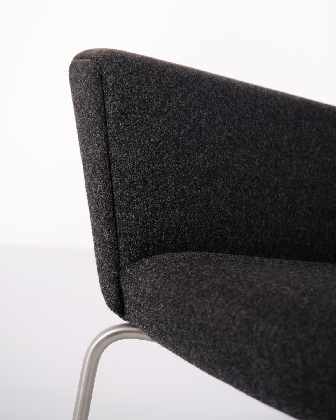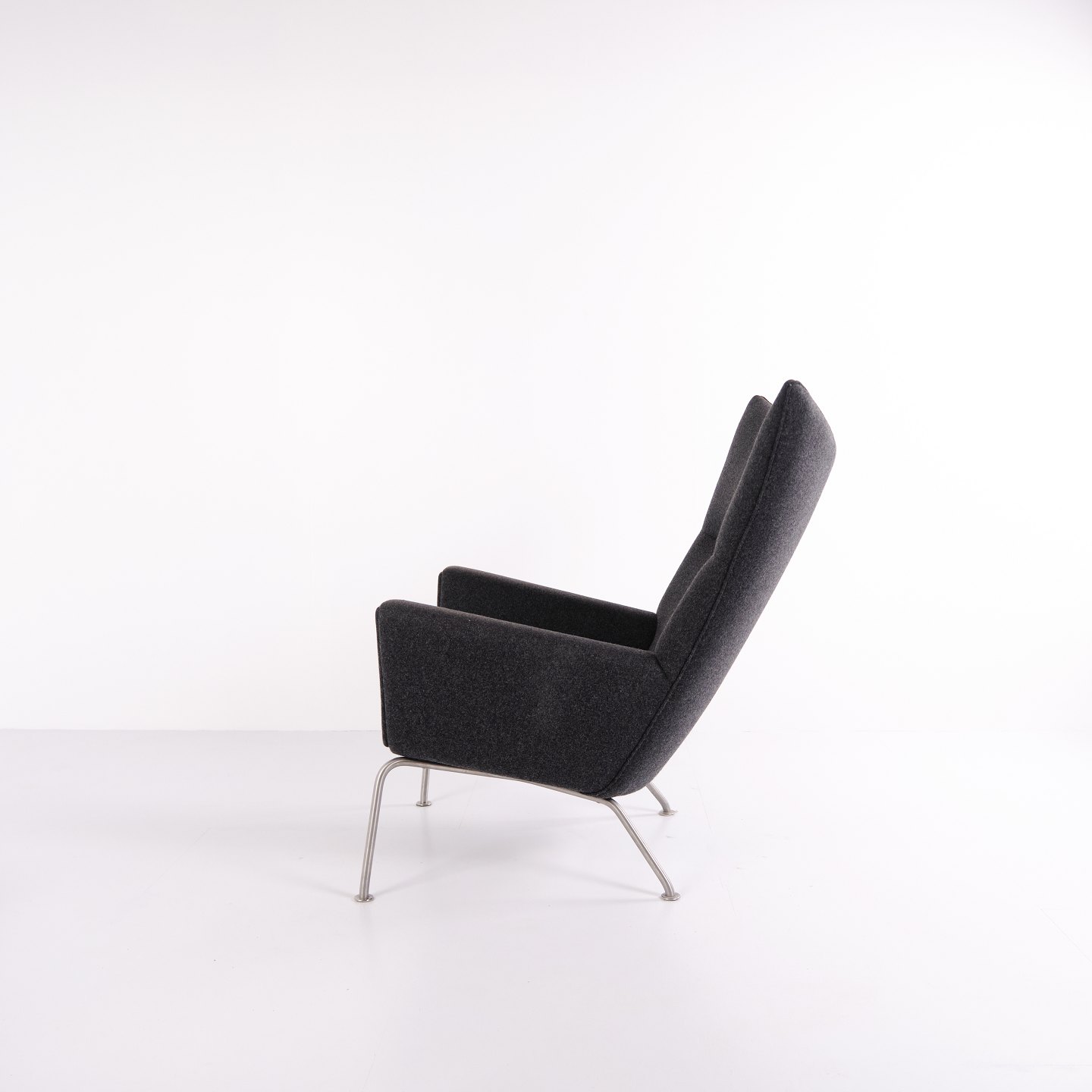 Wingchair CH445 designet af Hans J. Wegner og produceret af Carl Hansen & Søn. Udført i gråt Hallingdal-stof med tilhørende skammel i samme polstring. Klassisk Wegner-model med høj ryg, markante vinger og solid komfort. Et anerkendt dansk designikon.