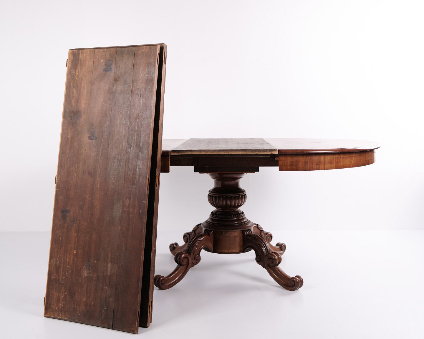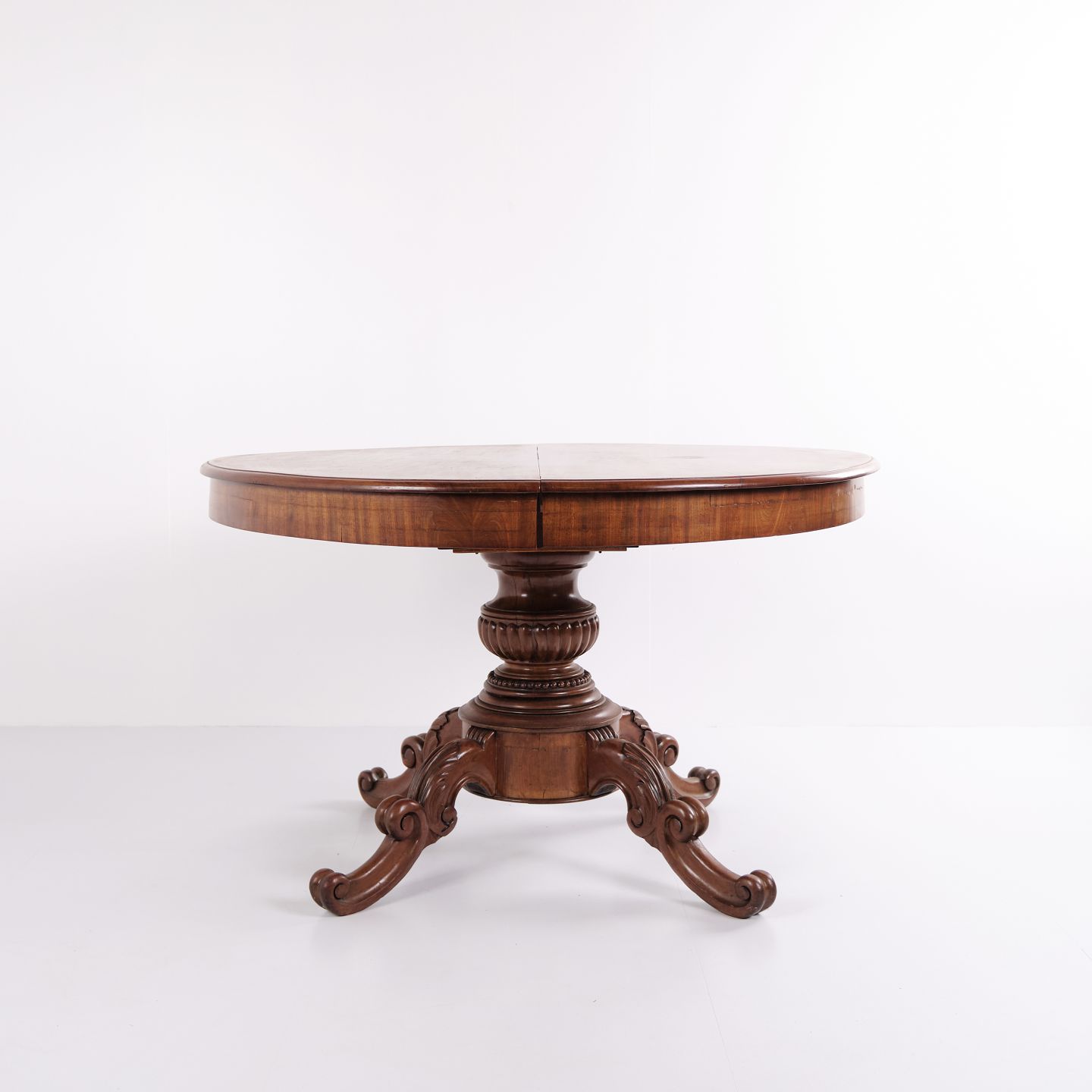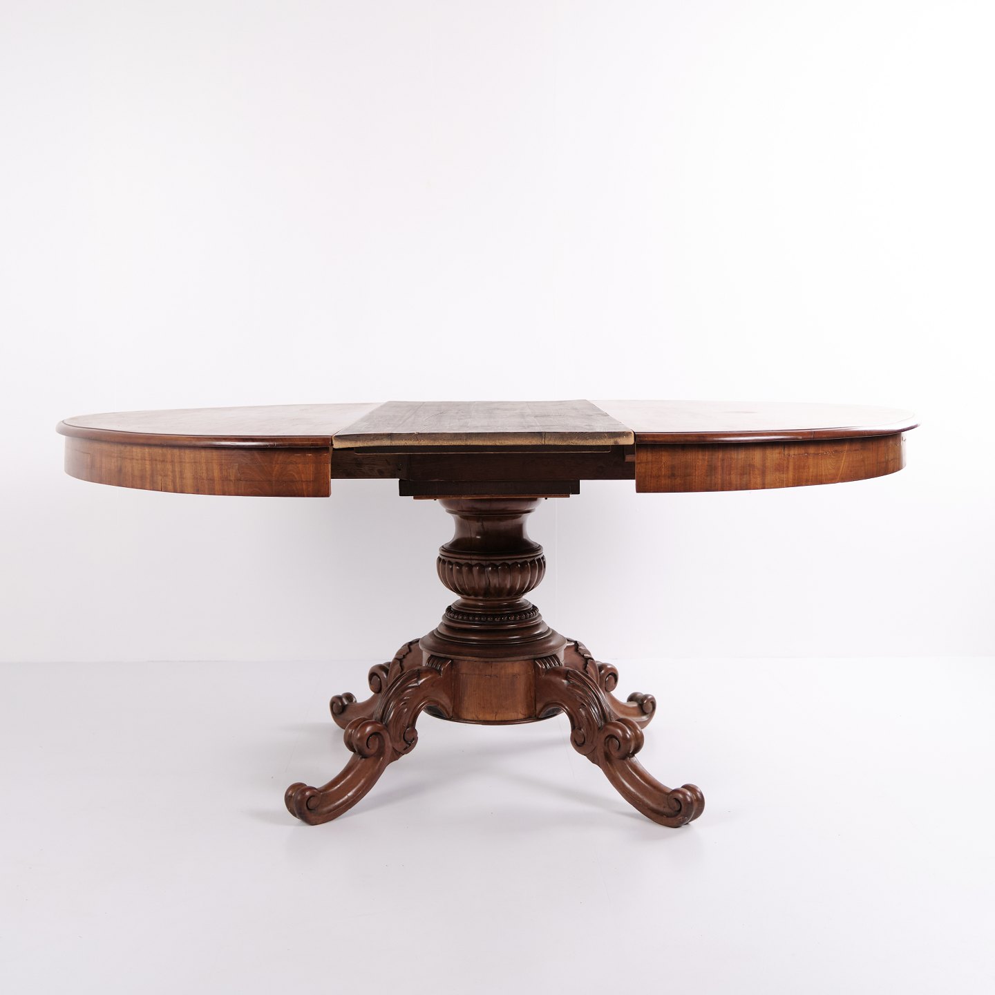 Søjlebord i sen Empire stil fra ca. 1840’erne, udført i mahogni med rige udskæringer og klassisk formsprog. Bordet kan udvides med fire tillægsplader og fungerer både som spisebord og dekorativt møbel i større rum.