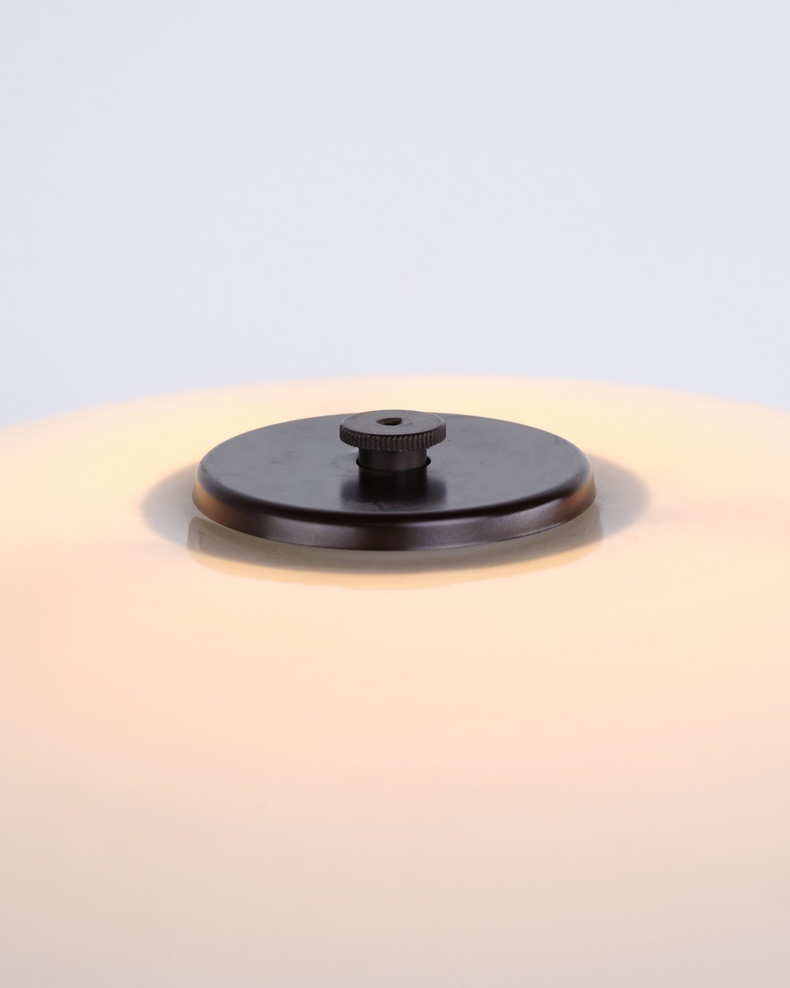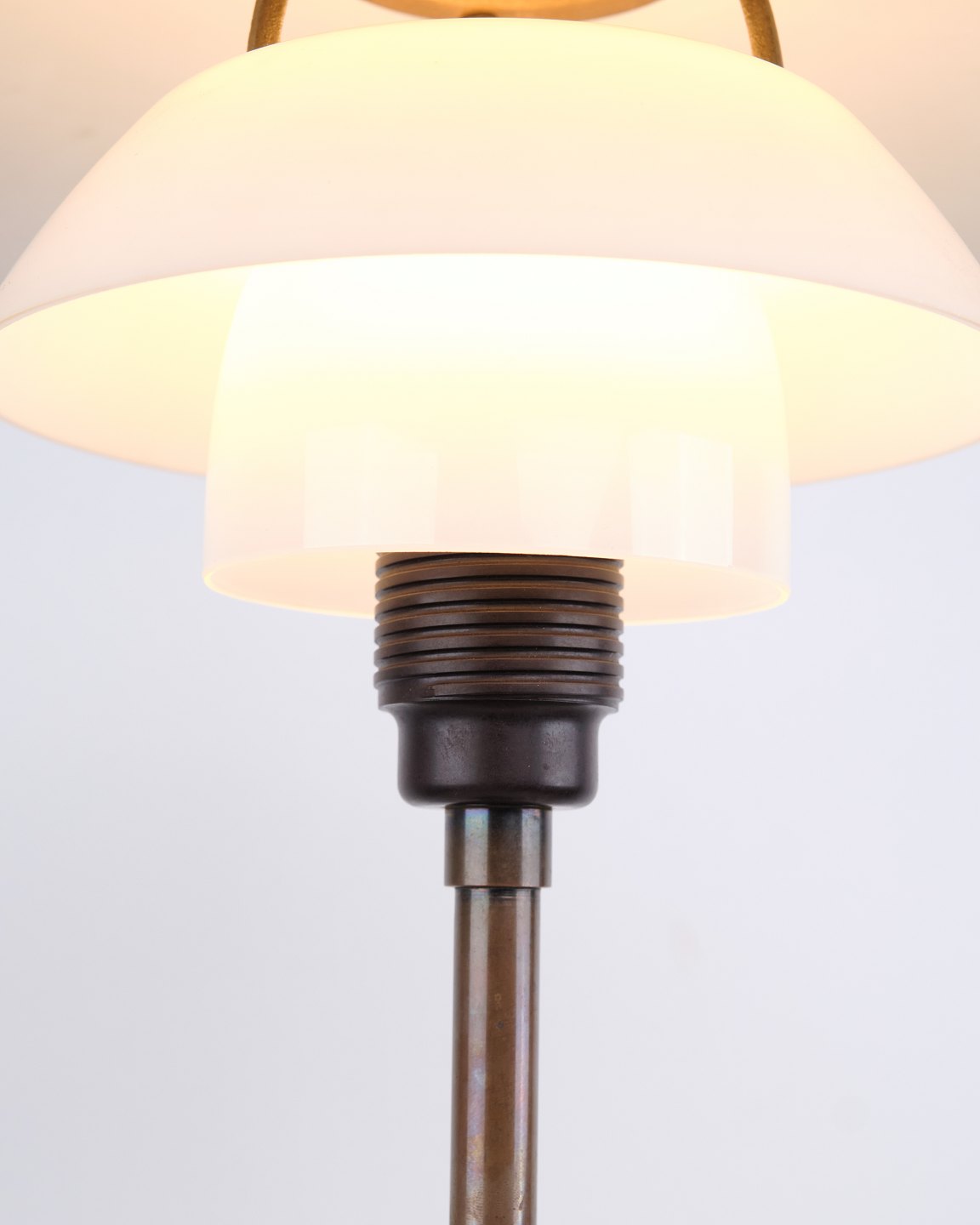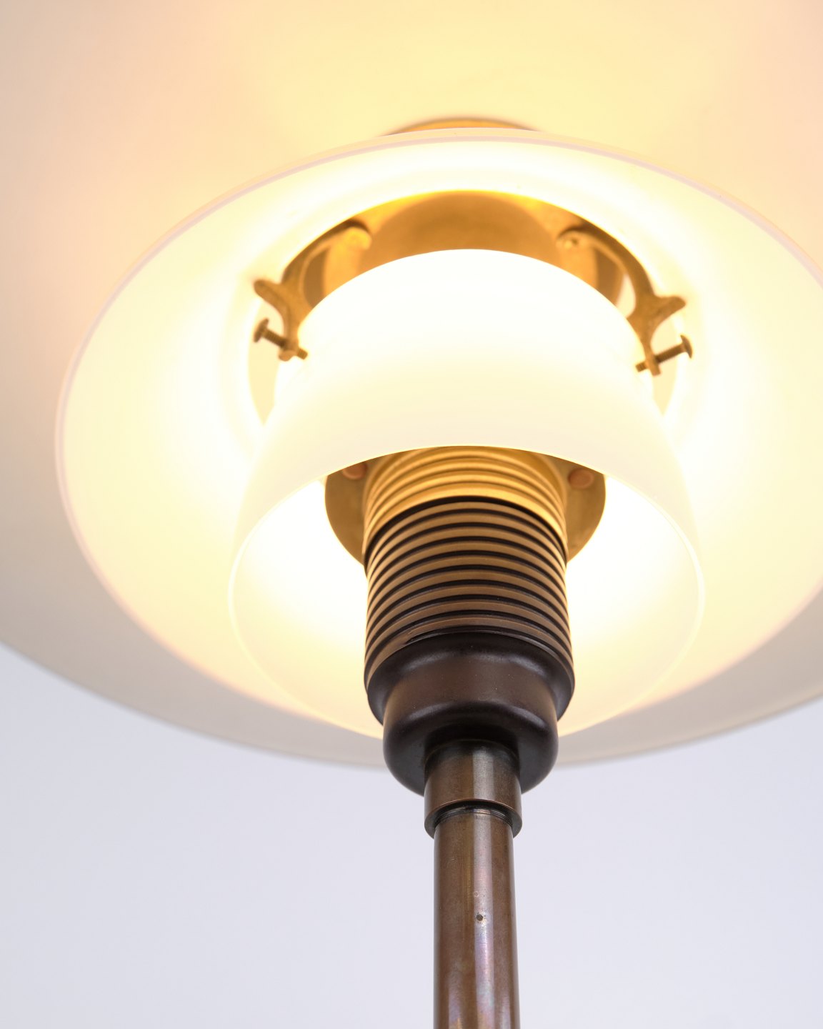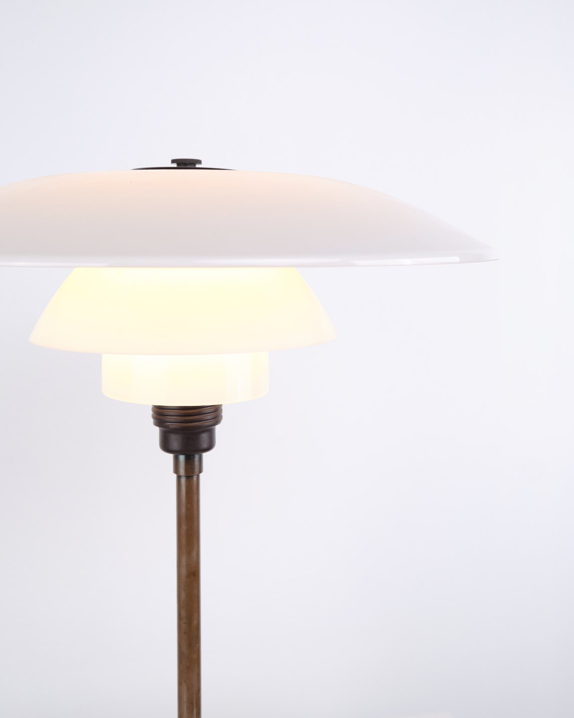 PH 4/3 bordlampe designet af Poul Henningsen og fremstillet af Louis Poulsen i 1930’erne. Lampen er udført i bruneret messing med skærme i hvidt opalglas, hvilket giver et varmt og afbalanceret lys. Det ikoniske flerskærmssystem er udviklet til at sikre blændfri belysning og optimal lysfordeling.