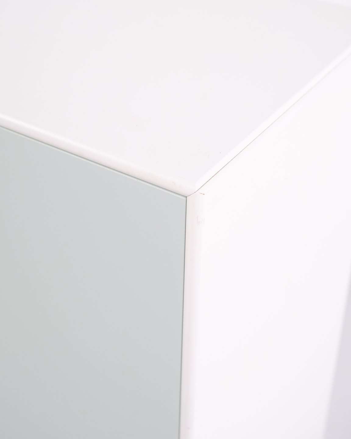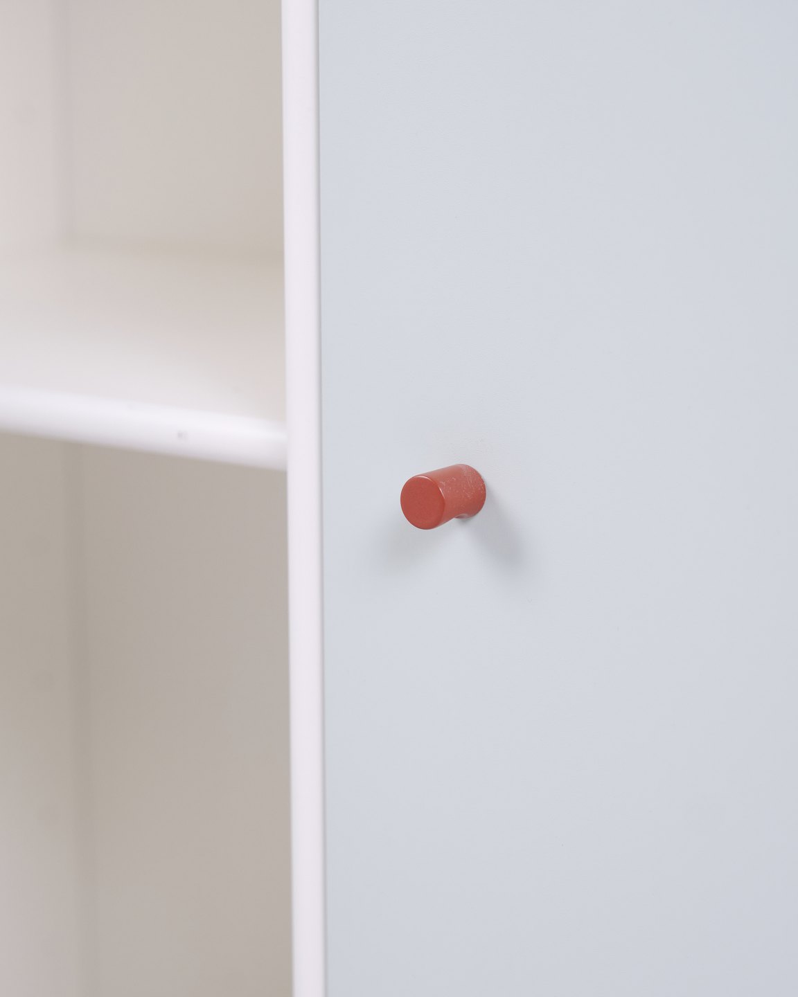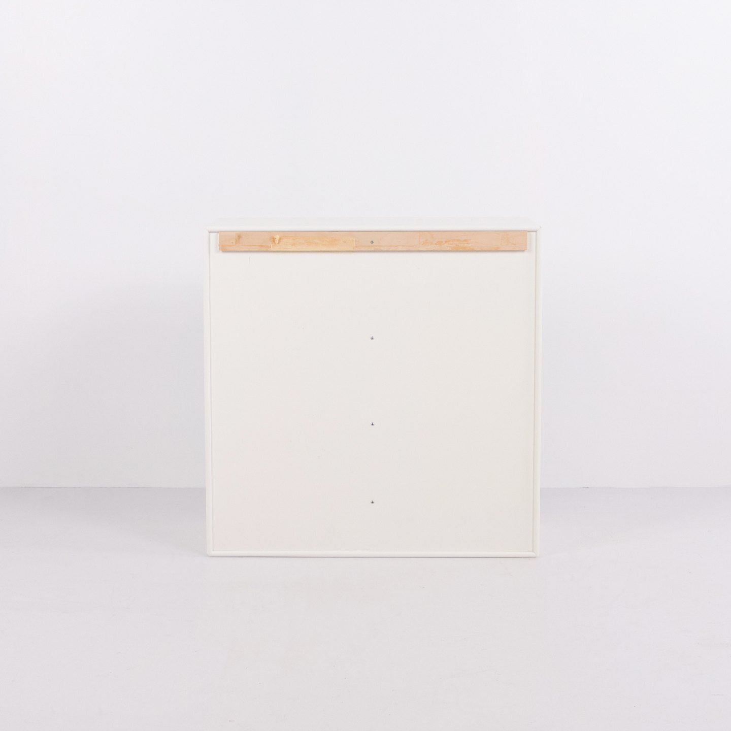 Montana skabmodul fra det modulære Montana System designet af Peter J. Lassen. Udført i lakeret MDF med hvid korpus, to mintgrønne låger og brune greb. Montana blev grundlagt i 1982 og er kendt for fleksible opbevaringsmoduler produceret i Danmark. Modellen kan anvendes som vægskab, entrémøbel, badeværelsesskab eller del af større Montana reolsystem. Montana fremstilles fortsat på Fyn og er kendt for høj finish samt stort farveudvalg.