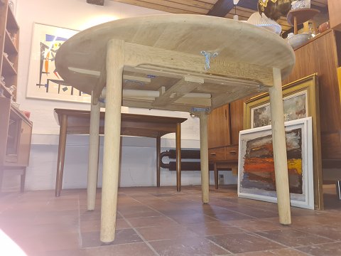 Kurt Østervig rundt spisebord udført i massiv eg samt 1 stk. tillægsplade også massiv eg. Fremstillet hos KP Møbler ca. 1980'erne. Mærket herfra.