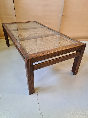 Sofabord i bejset og lakeret fyrretræ med flet og glasplade.