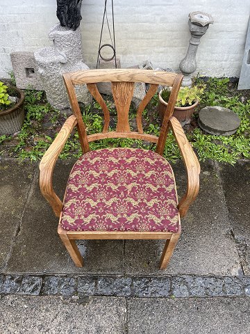 Dansk snedkermester armstol fra omkring 1930’erne i massiv egetræ og sæde i møbelstof.
