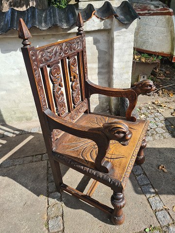 Kongearmstol fra 1920´erne i eg med udskæringer. Fremstår pæn og velholdt uden nævneværdige brugsspor.