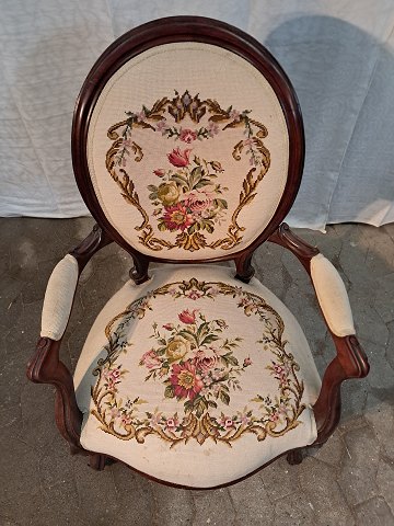 Armstol i massivt mahogni med broderet betræk, fra 1890erne.