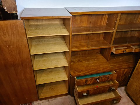 Funkis inspireret dækketøjsskab fra 1940'erne I Cuba mahogni og med glas skydelåger. Fremstår pænt, velholdt og udmærket funktionsdygtigt.