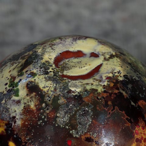 Vase i farvet glas designet af Marianne Buus, OBS revnet gennem korpus,