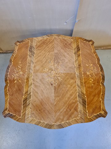 Sofabord i fineret og lakeret mahogni med intarsia af rosentræ fra 1980erne.
