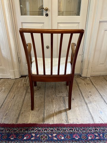 Dansk snedker armstol i bejdset bøgetræ sæde betrukket med hvidt stof. Udført ca. 1930'erne. Brugt stand fremstår med ridser og mæker, samt betræk med pletter.