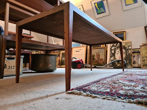 Severin Hansen sofabord fra 1970'erne I teak finér. Fremstår vakkelvornt og med en skade over det ene ben (billede) ellers ok pænt på overfladen.