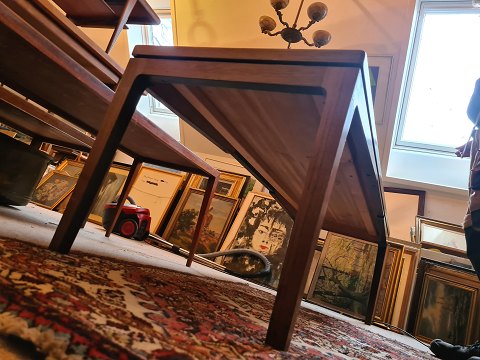 Dansk Design sofabord fra 1970'erne I palisander finér med kakler indlagt i den ene ende. Fremstår pænt og velholdt uden de stor brugsspor. Dog enkelte lettere overflade ridser på bordpladen.