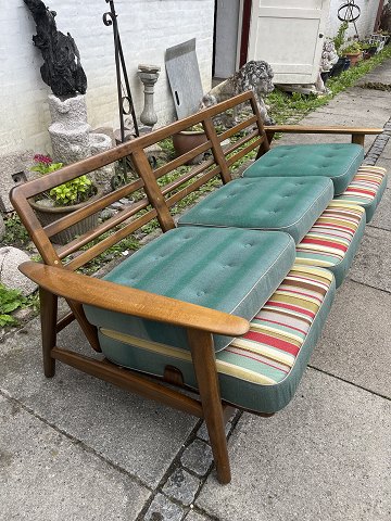 Hans J. Wegner 3. Personers sofa i bejset bøgetræ og fjedrehynder betrukket med Uldstof produceret af Getama i 1950’erne.