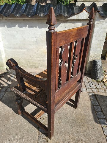 Kongearmstol fra 1920´erne i eg med udskæringer. Fremstår pæn og velholdt uden nævneværdige brugsspor.