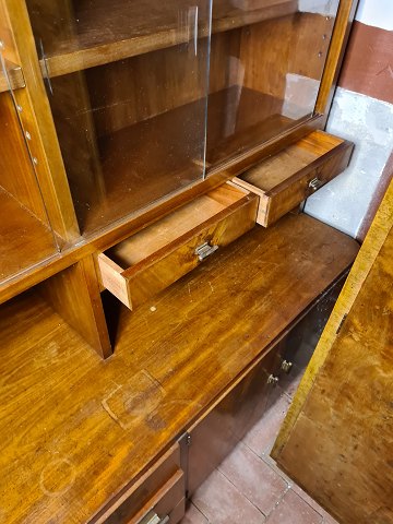 Funkis inspireret dækketøjsskab fra 1940'erne I Cuba mahogni og med glas skydelåger. Fremstår pænt, velholdt og udmærket funktionsdygtigt.