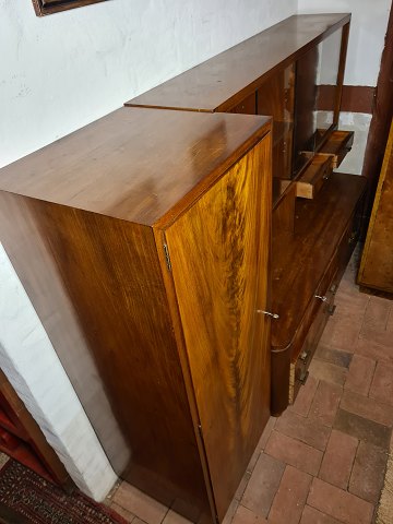Funkis inspireret dækketøjsskab fra 1940'erne I Cuba mahogni og med glas skydelåger. Fremstår pænt, velholdt og udmærket funktionsdygtigt.