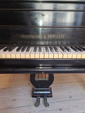 Sort lakeret flygel bygget af Hornung & Møller. Fremstår flot og velholdt kun med få og små lakafskalninger på udsatte kanter. Spiller på alle tangenter. Til fremsøgning af byggeår og diverse nærmere unikke omstændigheder for flygelet er stelnummuret 39311. (Billede)