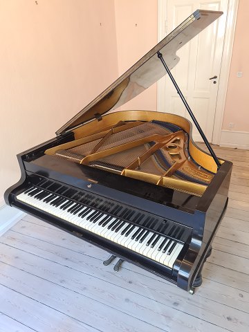 Sort lakeret flygel bygget af Hornung & Møller. Fremstår flot og velholdt kun med få og små lakafskalninger på udsatte kanter. Spiller på alle tangenter. Til fremsøgning af byggeår og diverse nærmere unikke omstændigheder for flygelet er stelnummuret 39311. (Billede)