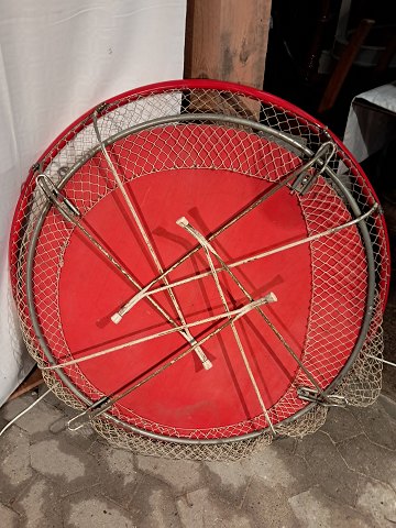 Kravlegård i metal med rød plastik og fiskenet, fra 1960erne.