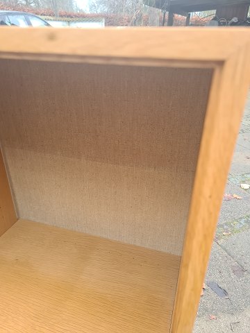Reol i finéret eg med underskab og hessian beklædt bagbeklædning. Ydført hos HG Funiture i 1970'erne. Fremstår pæn og velholdt uden de store brugsspor.