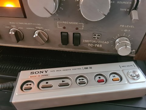 Spolebåndoptager fra Sony model TC-765. Fremstillet i 1979 og virker fint. Den kunne nok godt bruge en anelse service for at fremstå optimalt. NB svagt indridset på fronten. (Billede) Fjernbetjening model medfølger GM-30 medfølger. Den er ligeledes testet : Rewind virker ikke. Pause sporadisk og resten virker fint.