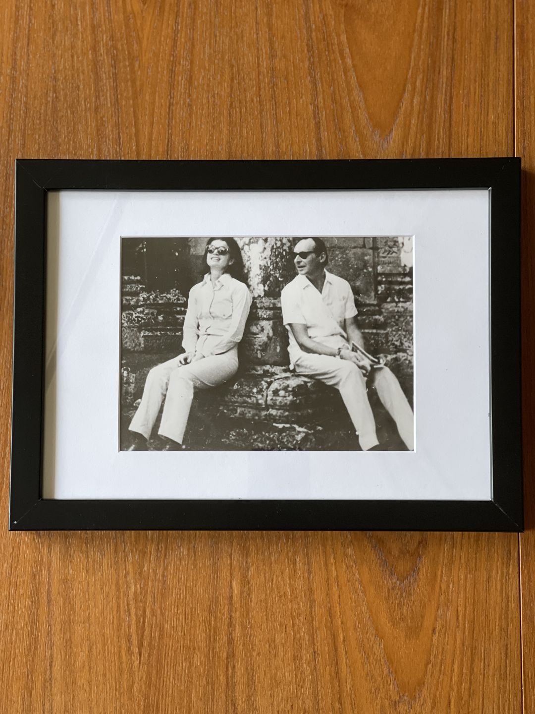 The photo shows Jackie Kennedy and the British Lord Harlech sitting together in front of a temple in Cambodia.