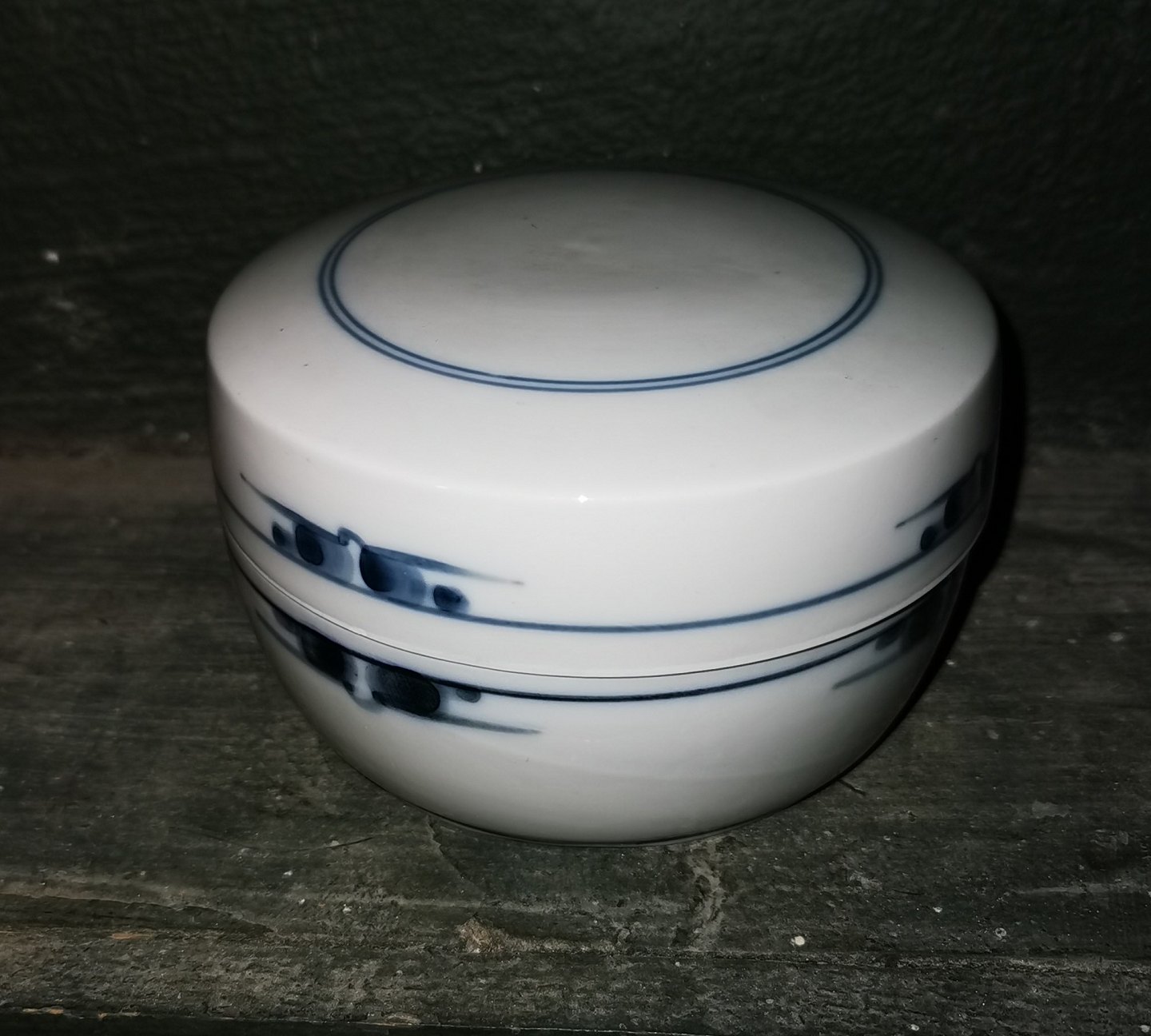 Royal Copenhagen Geminia lidded bowl in faiance. Model number 14624. In good condition. Factory second production. Measures: 7 cm high.
