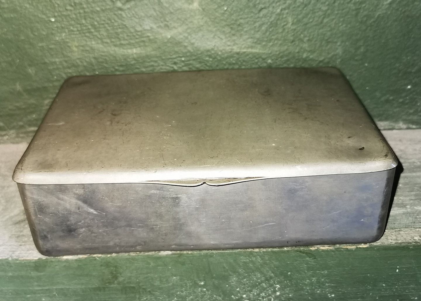 Box intended for cigars in tin. Produced by Hans Peter Hertz, who took over production from Mogens Ballin's workshop. Lid is slightly bent. Otherwise nothing to notice. The factory mark on the bottom with HPH Denmark and 1719 (1917). Dimensions: H. 7 cm and 14 x 22 cm (2.75 inches high. Also 5.51 x 8.66 inches).