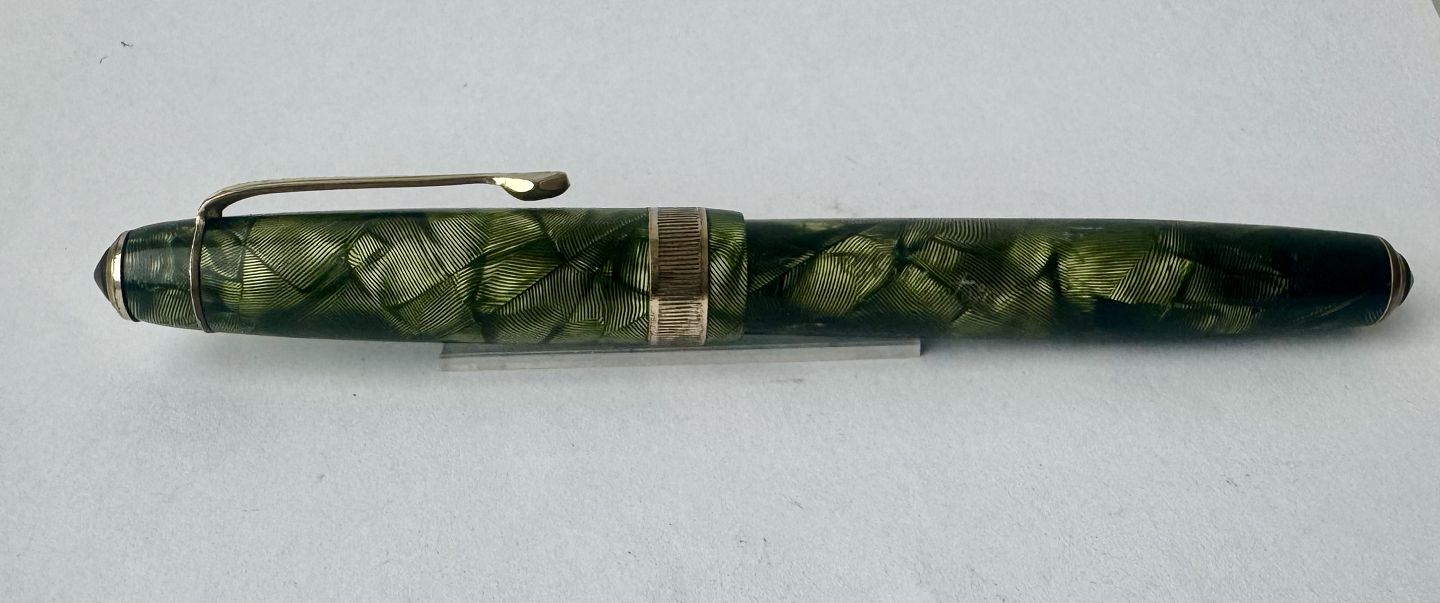 Large green marbled Big Ben fountain pen With wide ribbed belly band on the cap. Appears in good condition with all original Big Ben parts, including a 14 carat gold nib. Before the fountain pen can absorb ink and write again, a new rubber bladder must be inserted. This task can be carried out for an additional charge of DKK 200. Length: 13.6 cm
