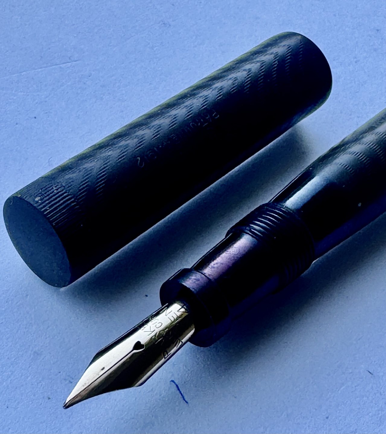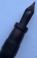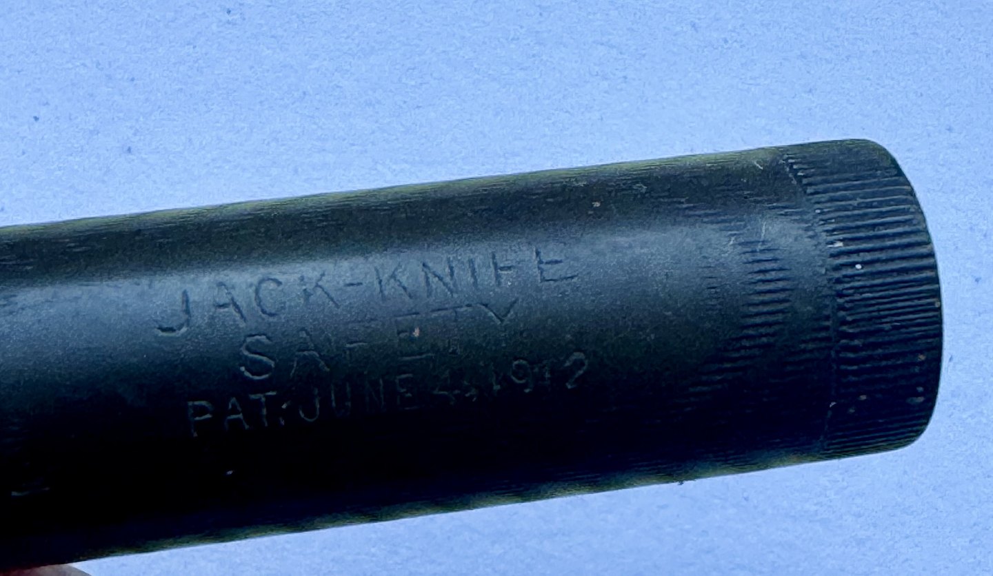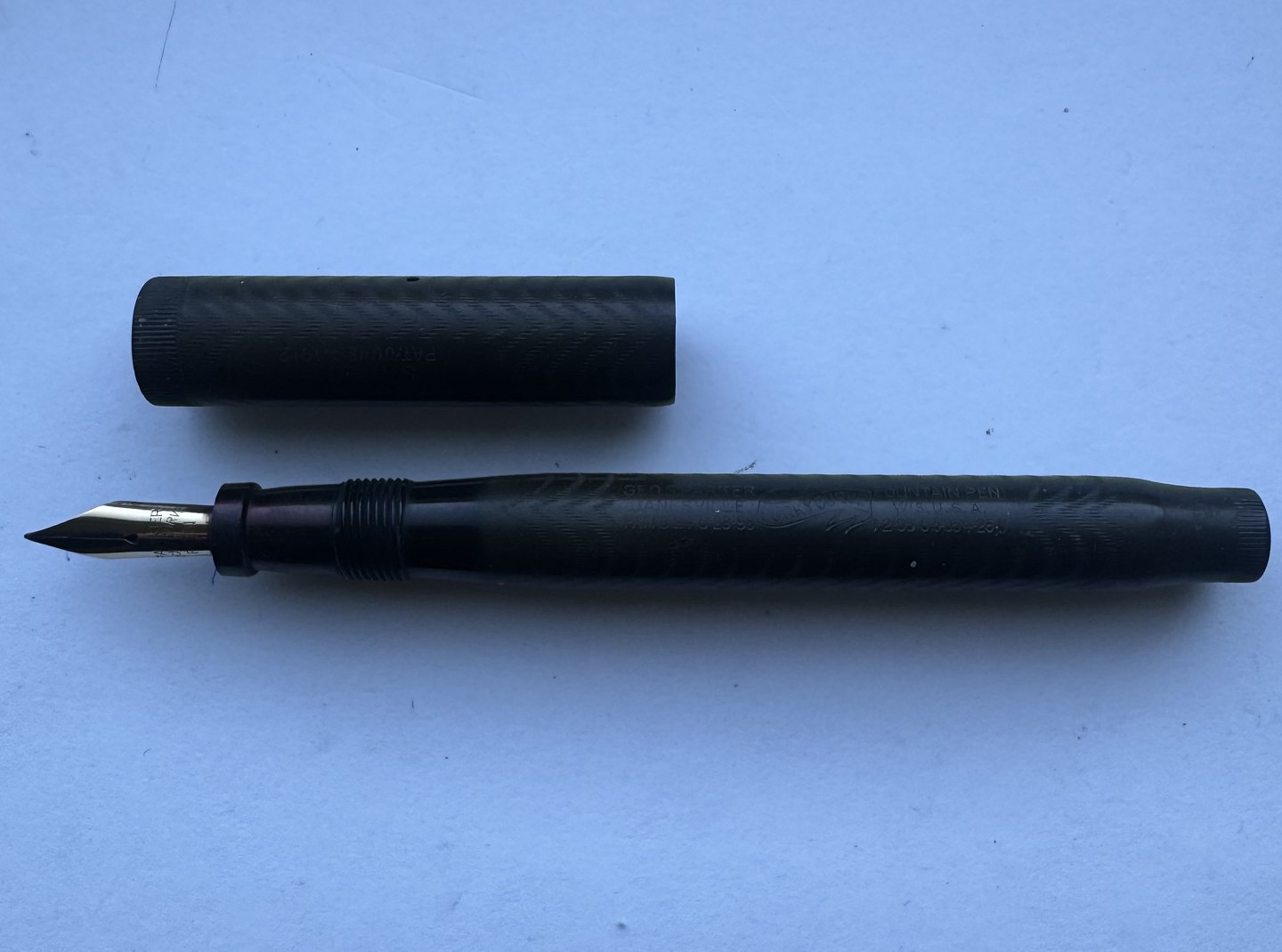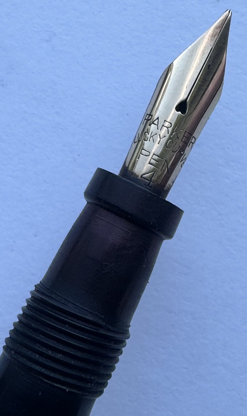 Sort Parker “Jack-Knife” Safety Lucky Curve fyldepen fra begyndelsen af 20. århundrede. Fungerer ikke. Der skal indsættes ny gummisæk før fyldepennen igen kan optage blæk og skrive igen. Fremstår i god stand. Dog mangler clip’en øverst på hætten. Fyldepennen er 13,5 cm lang.