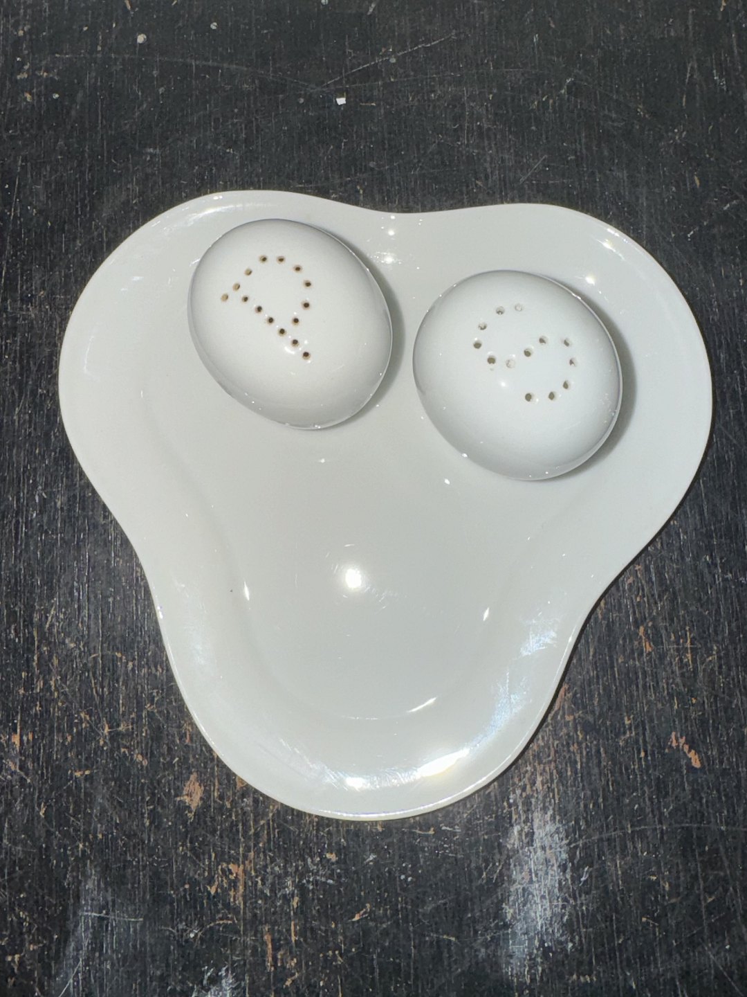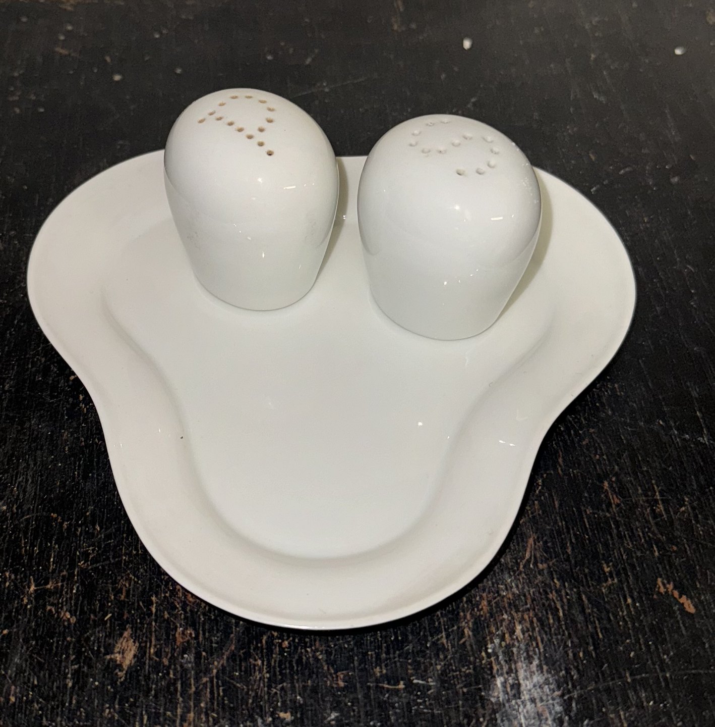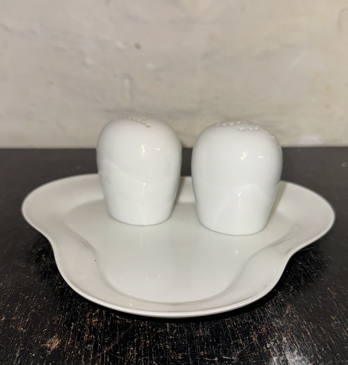 Bing & Grøndahl salt -og pebersæt i hvidt porcelæn på bakke. I god stand