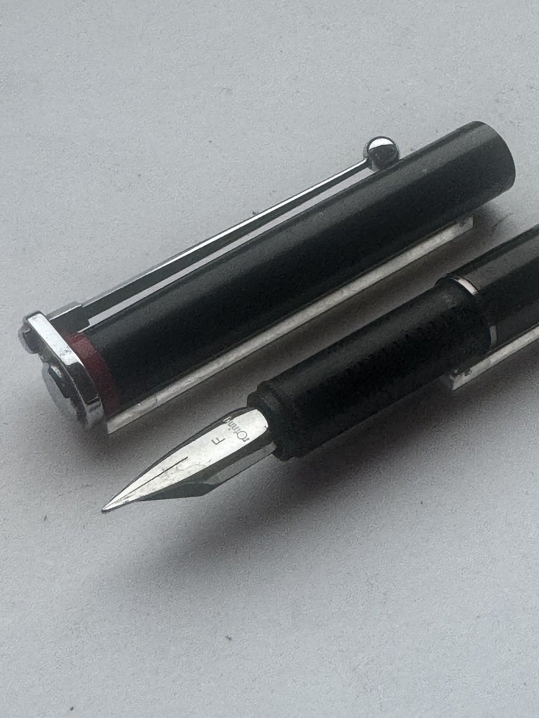 Rotring 700 fyldepen i stål fra 1990’erne. Fremstår i god og skriveklar stand. Mangler blot ny blæk-patron (cartridge) for at kunne skrive igen. Længde 14 cm.