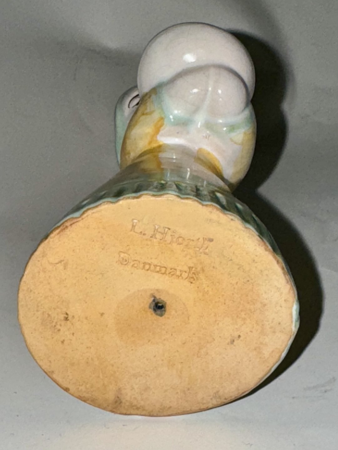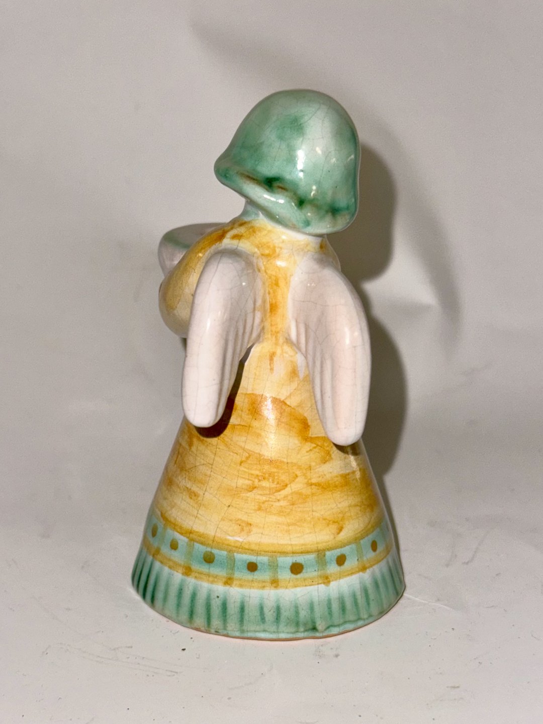 ENGEL I GUL KJOLE: Figur af bemalet engel i keramik som lyseholder fra den bornholmske lervarefabrik Lauritz Hjorth. Englen er iført gul kjole. Fremstår i god stand. Fabriksmærket på bunden. H. 10 cm