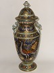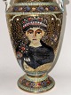 Deruta mosaik krukke med hanke og låg i majolika fremstillet i Umbrien i Italien. Motiv med afbildning af kejserinde Theodora, kejser Justinians byzantinske hustru fra det sjette århundrede, senere kanoniseret af den østlige ortodokse kirke som Saint Theodora. På bagsiden motiv med påfugl. Mosaik-designet er indgraveret med hånden, direkte på vasen, i stedet for små påsatte stykker. Emnet har et meget farvestærkt udtryk med metallisk overflade. Fremstår i god stand. Fabrikamærket på bunden. H. 33,5 cm inklusiv låg.