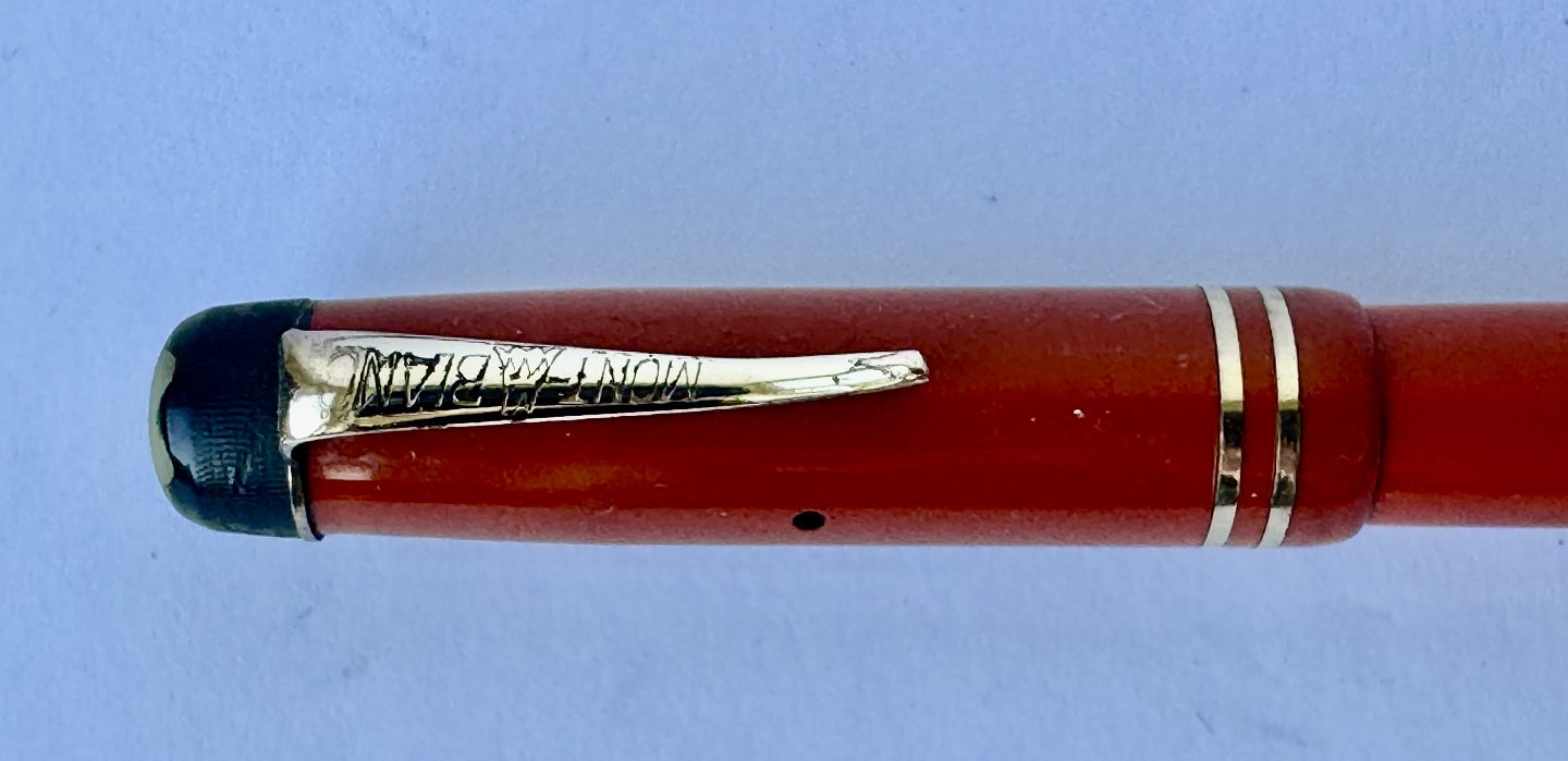 Koralrød Montblanc Simplo nr. 20 fyldepen. Push button filler. Produceret i 1930’erne i Danmark. Let udvisket fabrikslogo på “kroppen”. Enden på clip’en er knækket. Ellers ingen skader eller reparationer. Alle dele er originale Montblanc fra perioden inclusiv den flotte 14 karat guld spids. Fyldepennen fungerer ikke. Ved ekstra betaling på d.kr. 250,00 indsættes ny gummisæk, så den igen bliver funktionsduelig. Mål: L. 13 cm