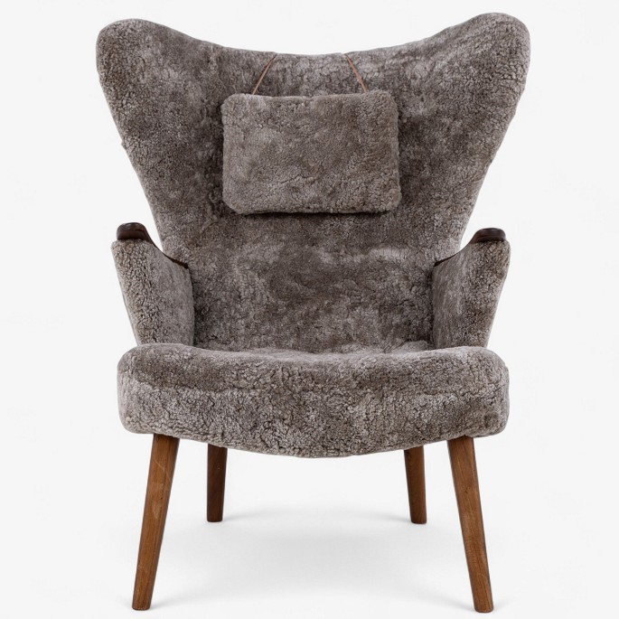 Nybetrukket lænestol med skammel i Scandilock-lammeskind (farve: Cork 19) og ben i hhv. teak og elm.