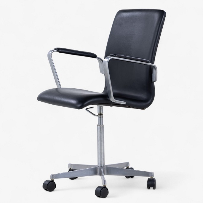 'Oxford'-kontorstol i stål med ryg, sæde og armlæn i sort læder. Mærket fra producent.