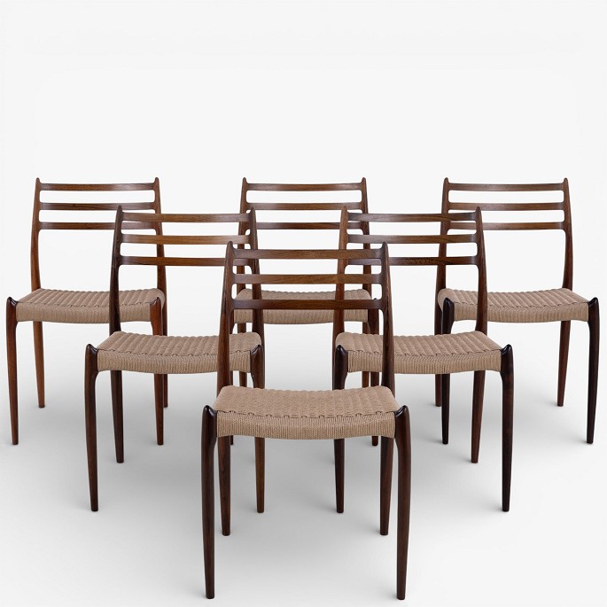 NO 78 - Set of 6 dining chairs in rosewood with paper yarn seats. Manufacturer's mark.