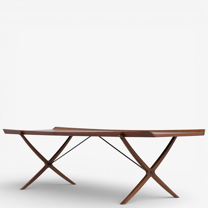 Rare 'X' coffee table with patinated teak top with fluted edge on cross frame. Manufacturer's stamp.