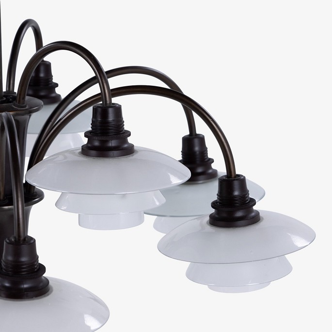 PH 1/1 - 'Bombardement'-lysekrone med 9 arme i bruneret messing og skærme i mat glas. Stemplet 'Patented'.