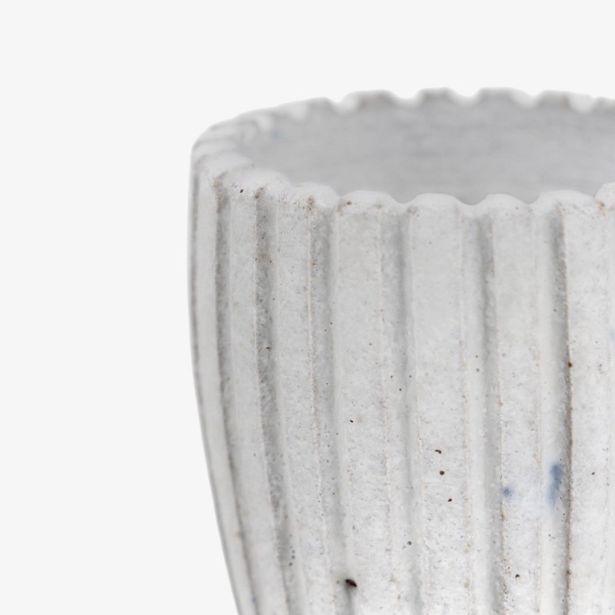 Lille, riflet vase i stentøj med hvid glasur. Signeret.