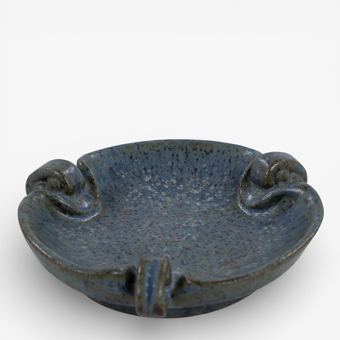Lille fad i stentøj m. blågrøn glasur. Signeret.