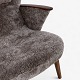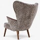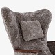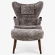 Nybetrukket lænestol med skammel i Scandilock-lammeskind (farve: Cork 19) og ben i hhv. teak og elm.