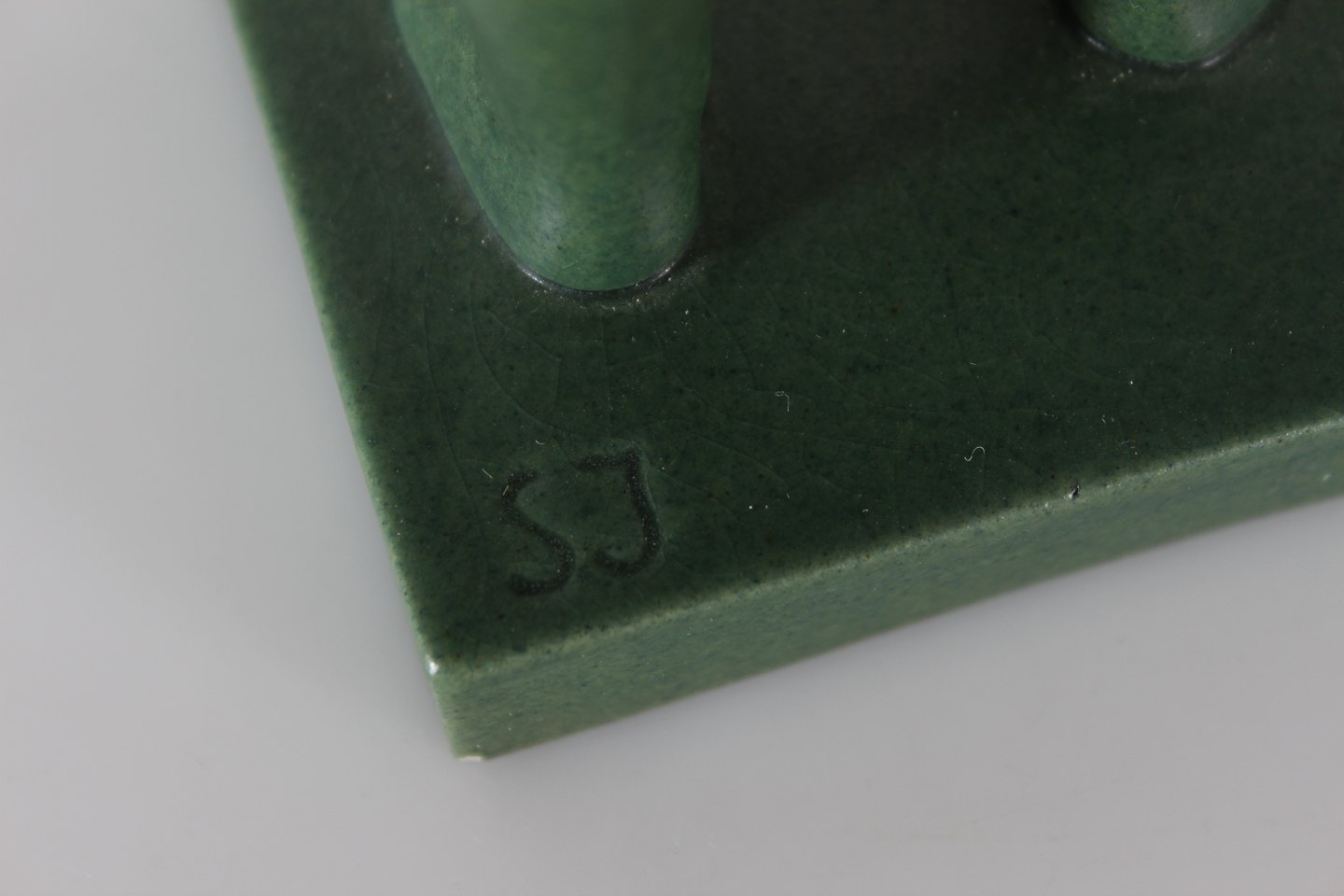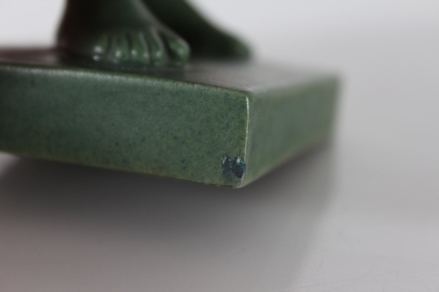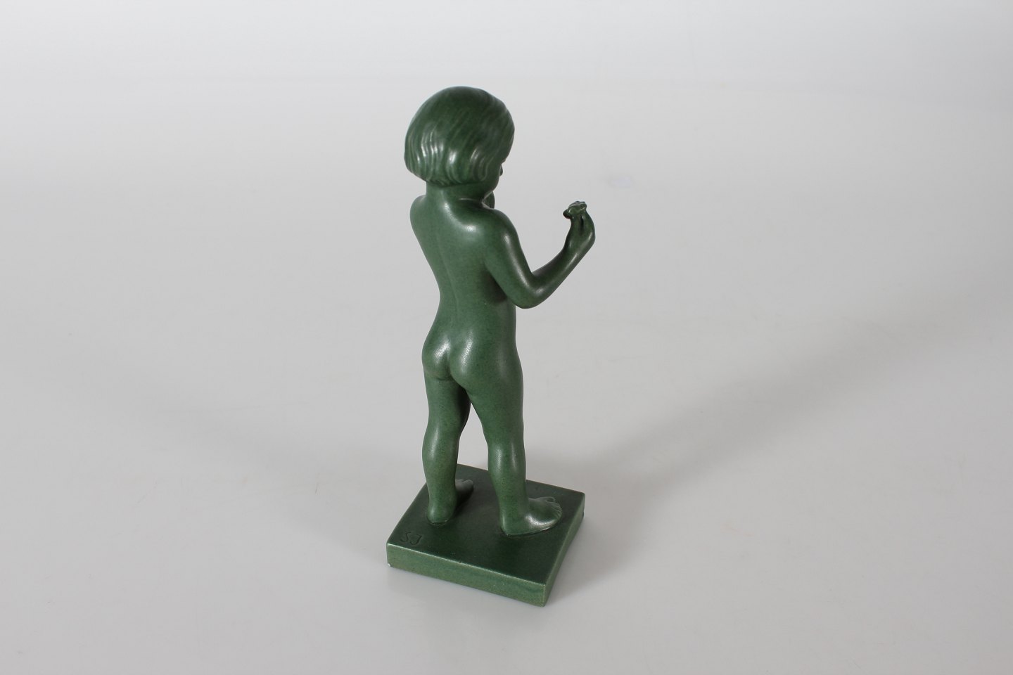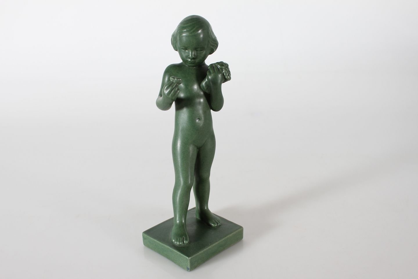 P. Ipsens Enke Figur af pige med blomster nr. 921 Formgjort af Svend Jespersen (1895-1985) Jadegrøn glasur dekoreret figur af keramik Højde 22 cm Fin stand - se billede af lille afslag på basen