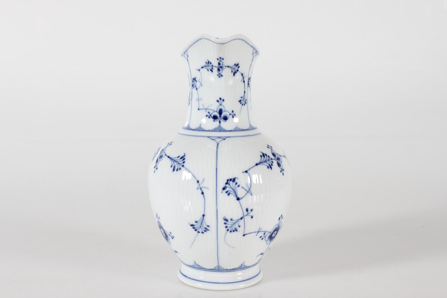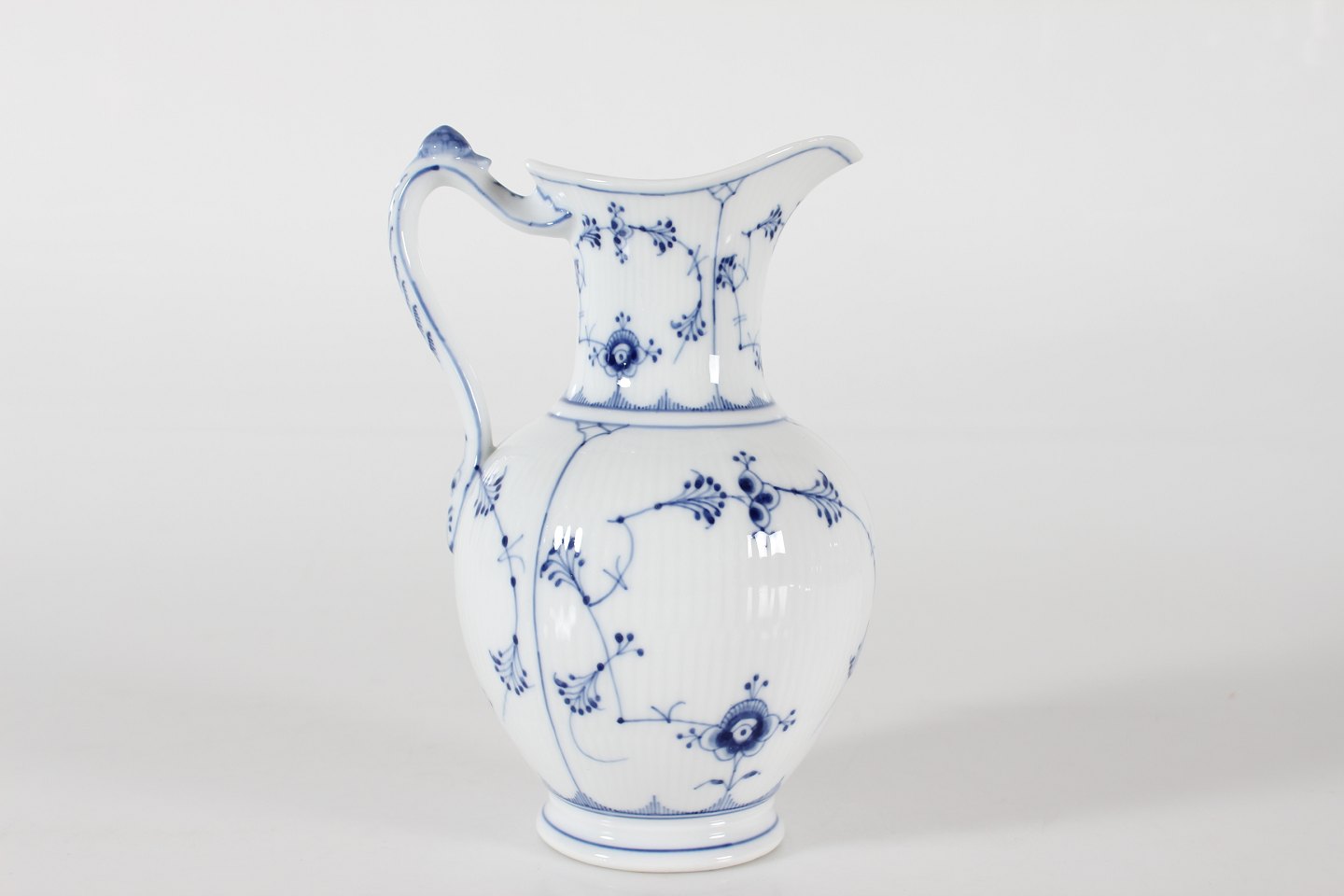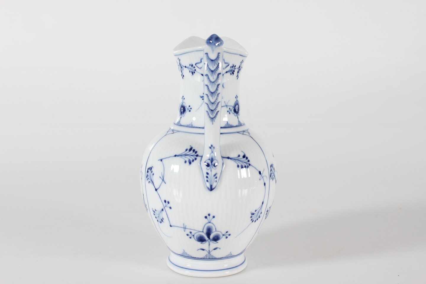 Royal Copenhagen Musselmalet Riflet Antik chokoladekande med låg nr. 1/482 med stempel fra perioden 1894-1922 Låg med senere stempel fra 1956 Højde 23 cm Længde 15 cm Bredde 13 cm Fin fejlfri 1 sortering