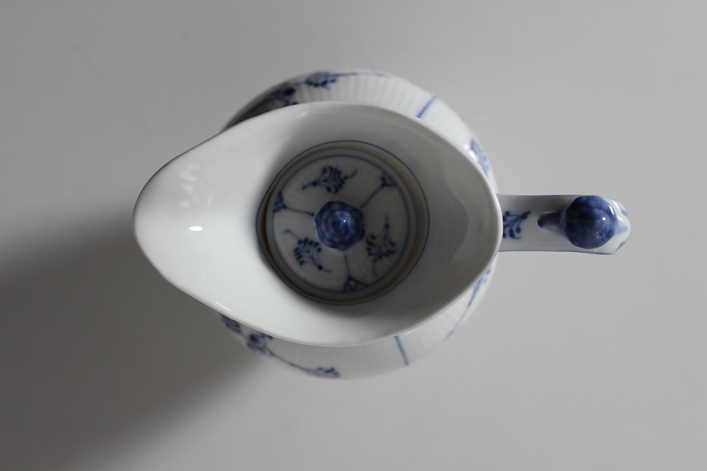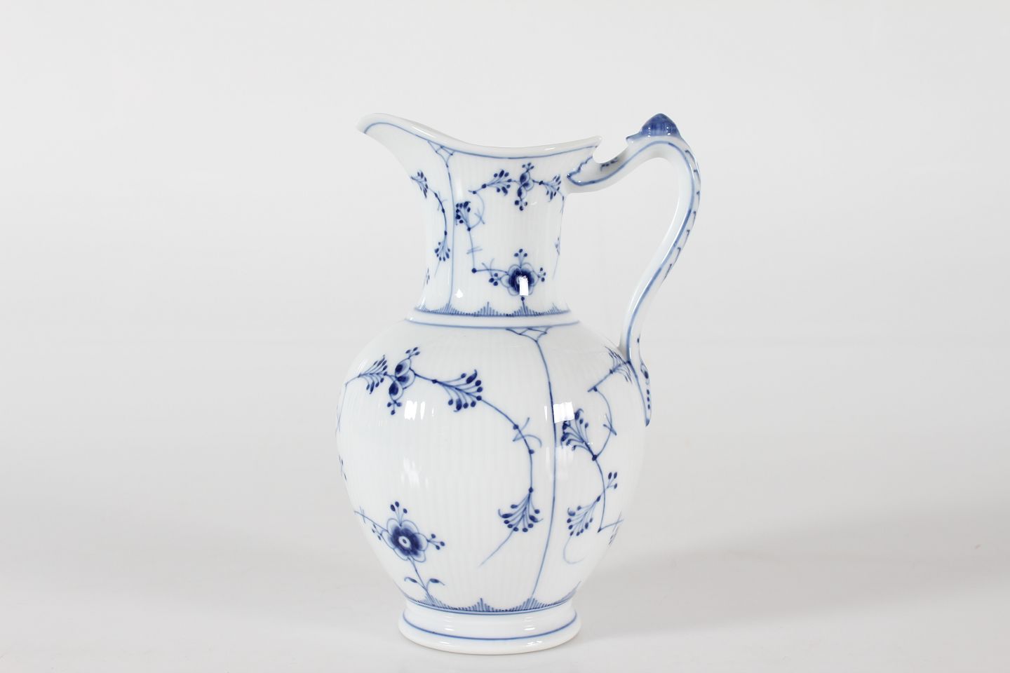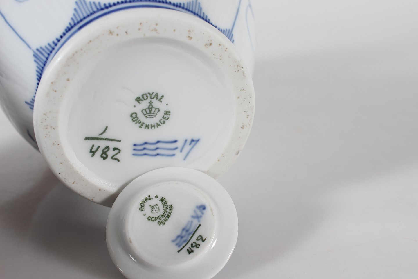 Royal Copenhagen Musselmalet Riflet Antik chokoladekande med låg nr. 1/482 med stempel fra perioden 1894-1922 Låg med senere stempel fra 1956 Højde 23 cm Længde 15 cm Bredde 13 cm Fin fejlfri 1 sortering