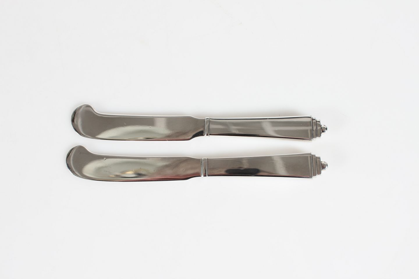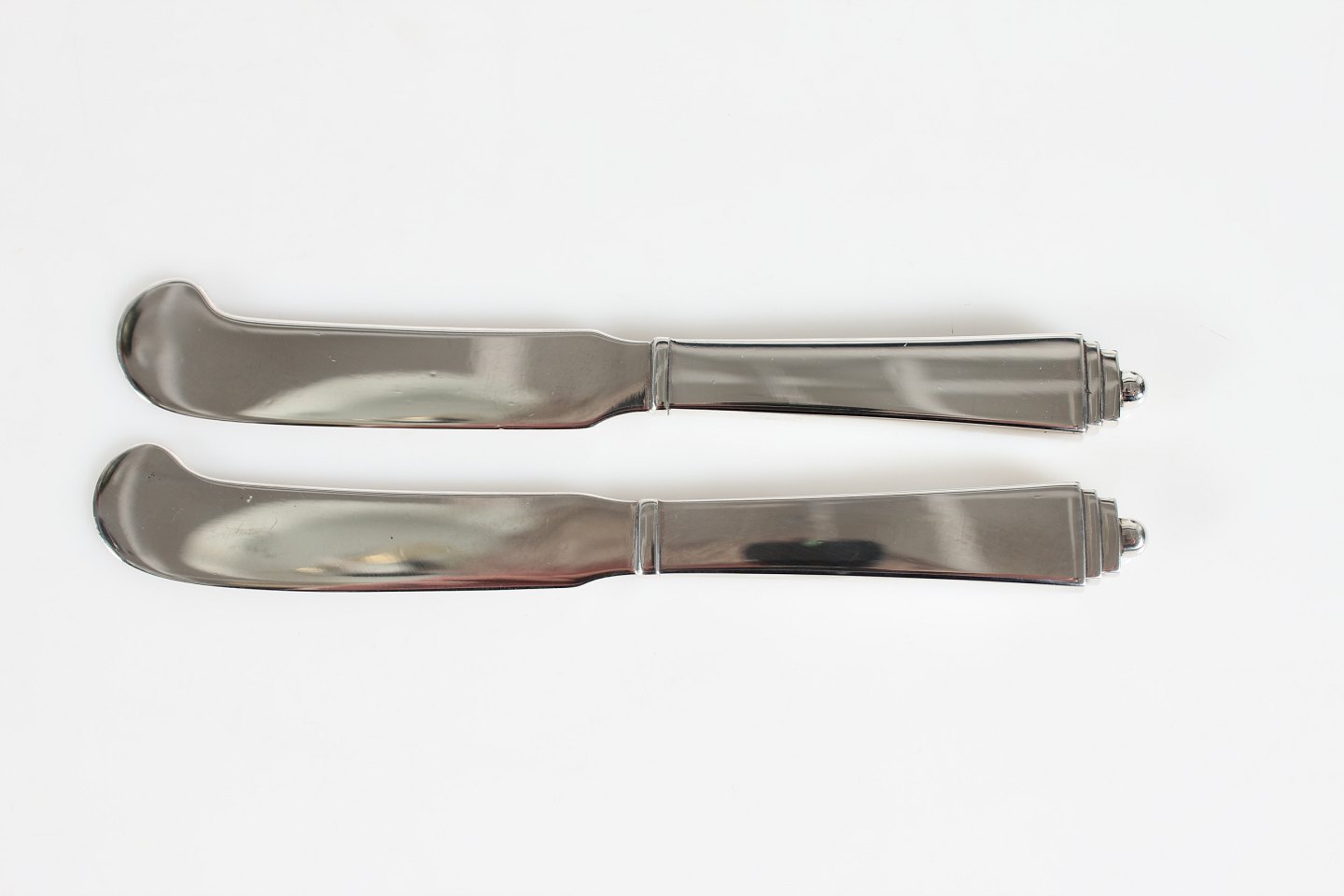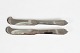 Georg Jensen Sølv Pyramide bestik tegnet af Harald Nielsen 1927 Oste- og smørknive fremstillet af fuld sterlingsølv Længde 14,5 cm Fremstillet af sterling sølv Fin stand uden indgravering eller lign.