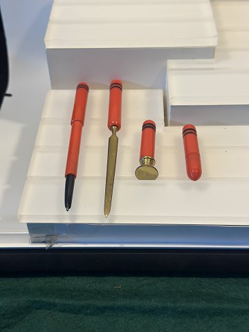 Skrivesæt art deco , fra 1930 erne , sætte består en pen ,en brevåbner og et blækhorn alt i rød farve og messingelementer